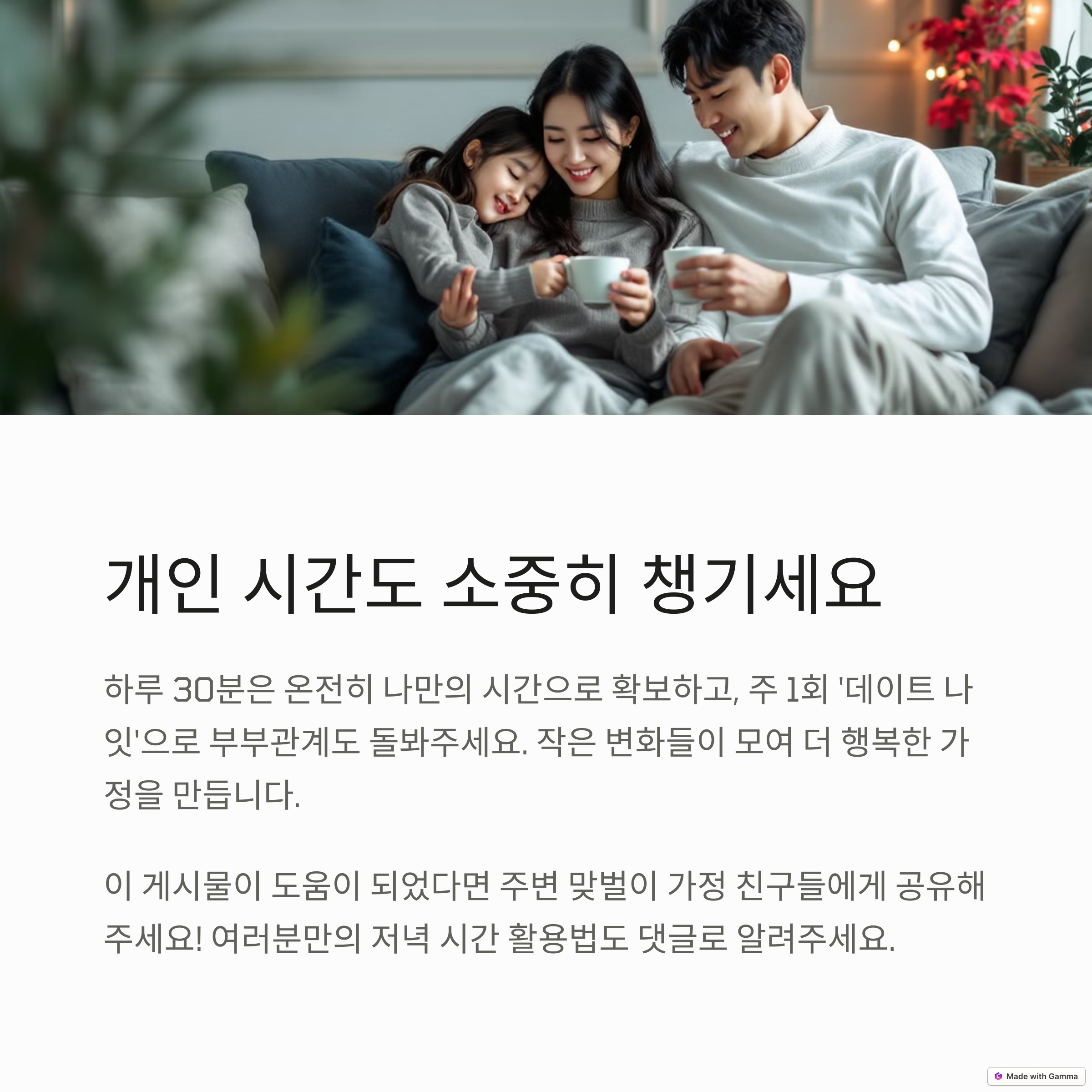 저녁시간은 단순히 하루를 마무리하는 시간이 아닌, 하루의 소중한 정리이자 가족과의 연결 고리입니다. 맞벌이 가정의 현실 속에서 그 소중한 시간을 놓치지 않으려면 더 나은 루틴과 소통 방식이 필요합니다. 오늘 소개한 팁들을 일상에 조금씩 적용하다 보면 더 여유롭고 따뜻한 저녁을 경험하실 수 있습니다. 앞으로도 작은 실천이 큰 변화를 만든다는 믿음을 갖고 우리 모두 균형 잡힌 삶을 함께 만들어가요.