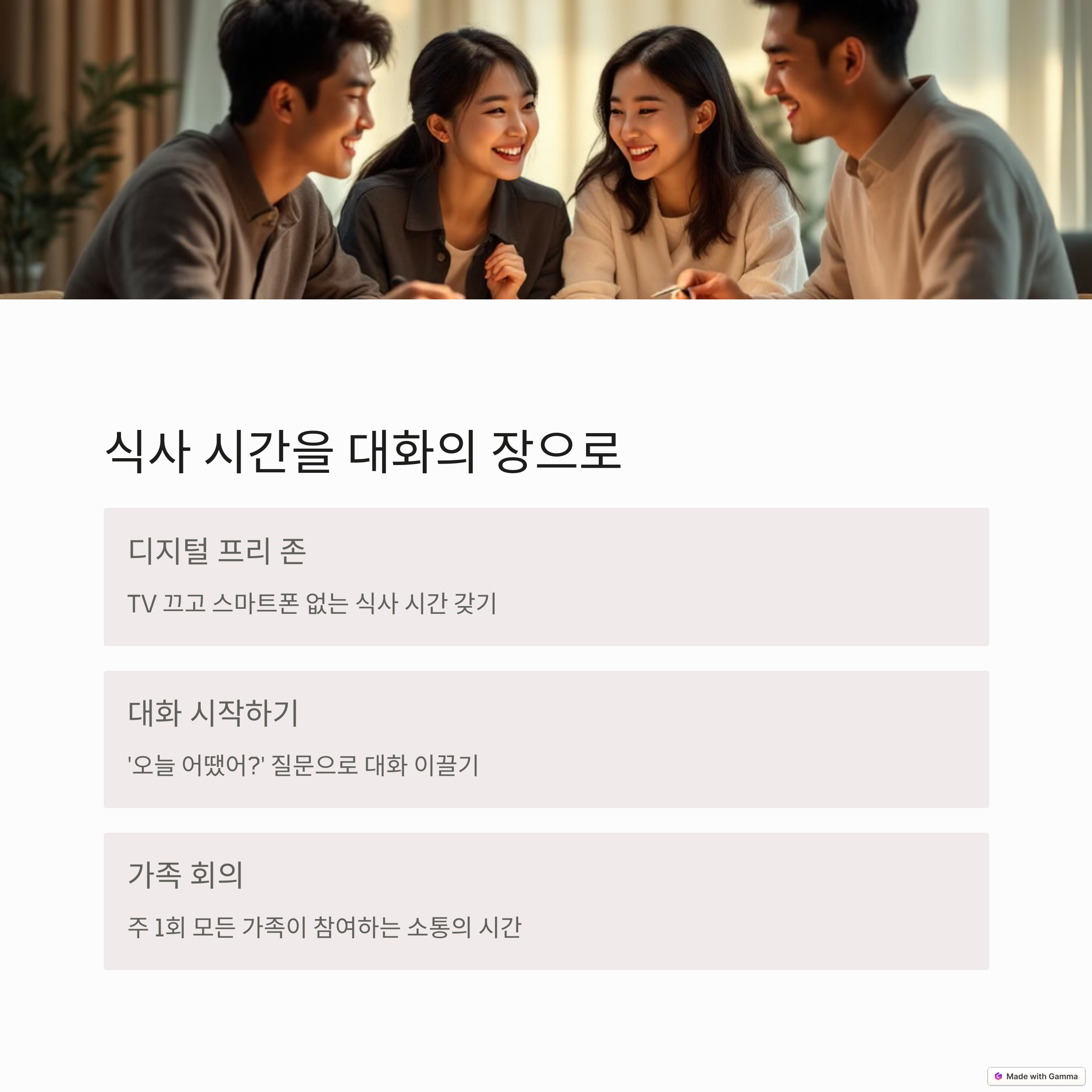 | 가족 소통법 | 짧은 대화라도 정성껏 나누면 효과가 큽니다. |