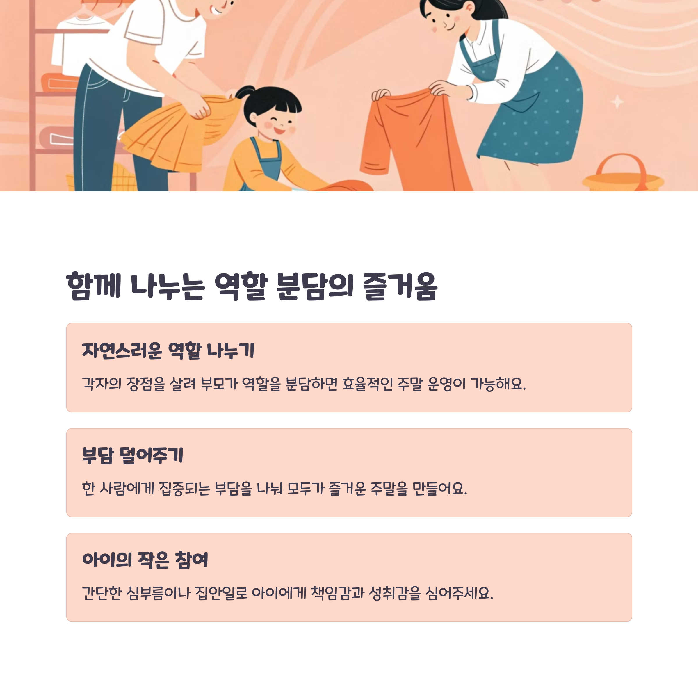 | 주말엔 가족 중심으로 계획 세우기 | 업무 아닌 가사도 나누는 습관 필요 | 반복되는 활동으로 안정감 형성 |