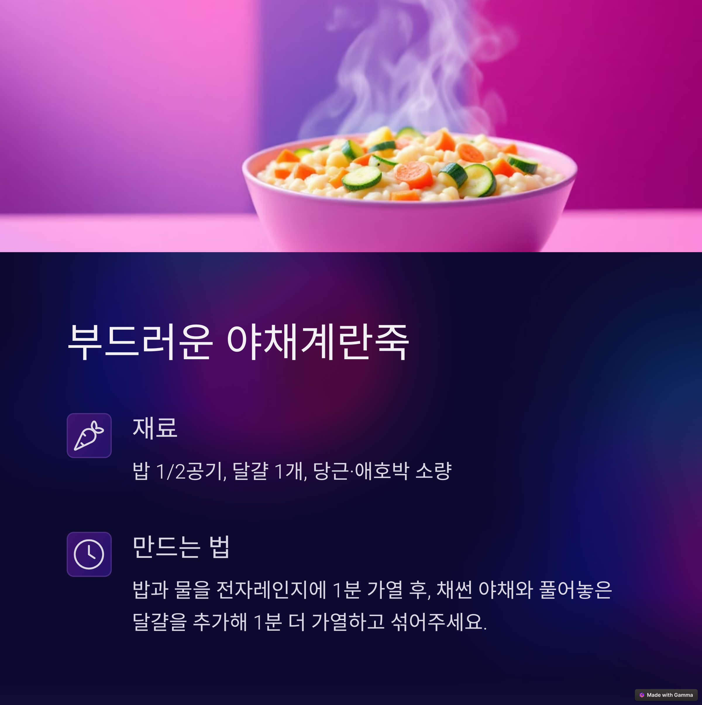 | 오트밀죽, 계란찜, 치즈롤 등 추천 | 시간 부족한 부모들을 위한 레시피 | 식감, 맛, 영양 모두 고려한 구성 |