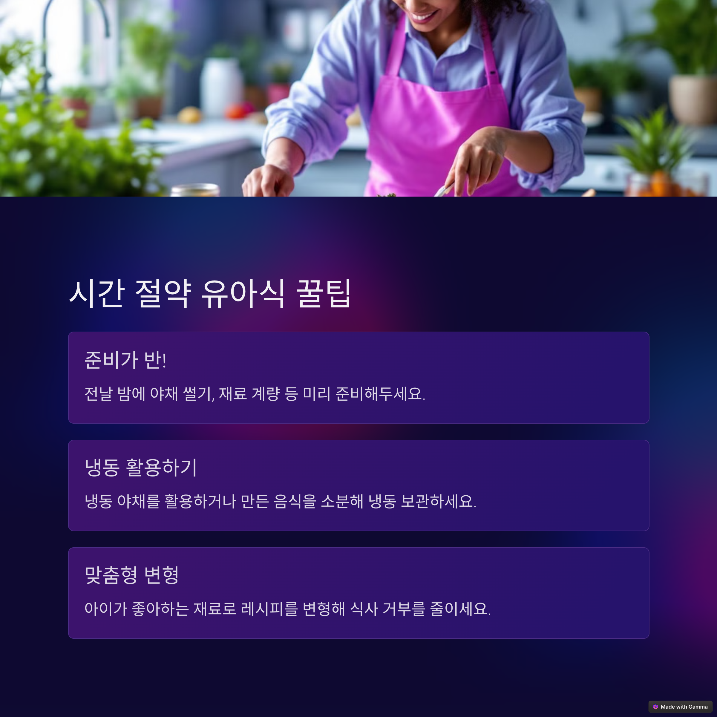 중요한 건 완성된 레시피의 외형이 아닙니다. 아이가 기분 좋게 먹는다는 것, 아침 식사가 스트레스가 아니라 즐거운 일상이 된다는 점이 핵심입니다. 무엇보다 부모님의 부담을 덜고, 아이의 건강을 지켜주는 식단 구성. 이 모든 것이 가능한 것이 바로 3분 유아식입니다.