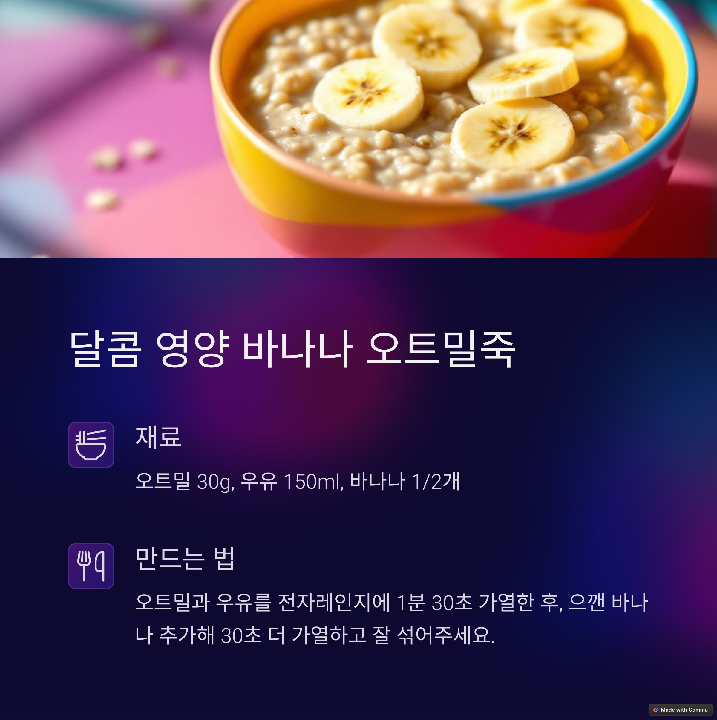 | 오트밀죽, 계란찜, 치즈롤 등 추천 | 시간 부족한 부모들을 위한 레시피 | 식감, 맛, 영양 모두 고려한 구성 |