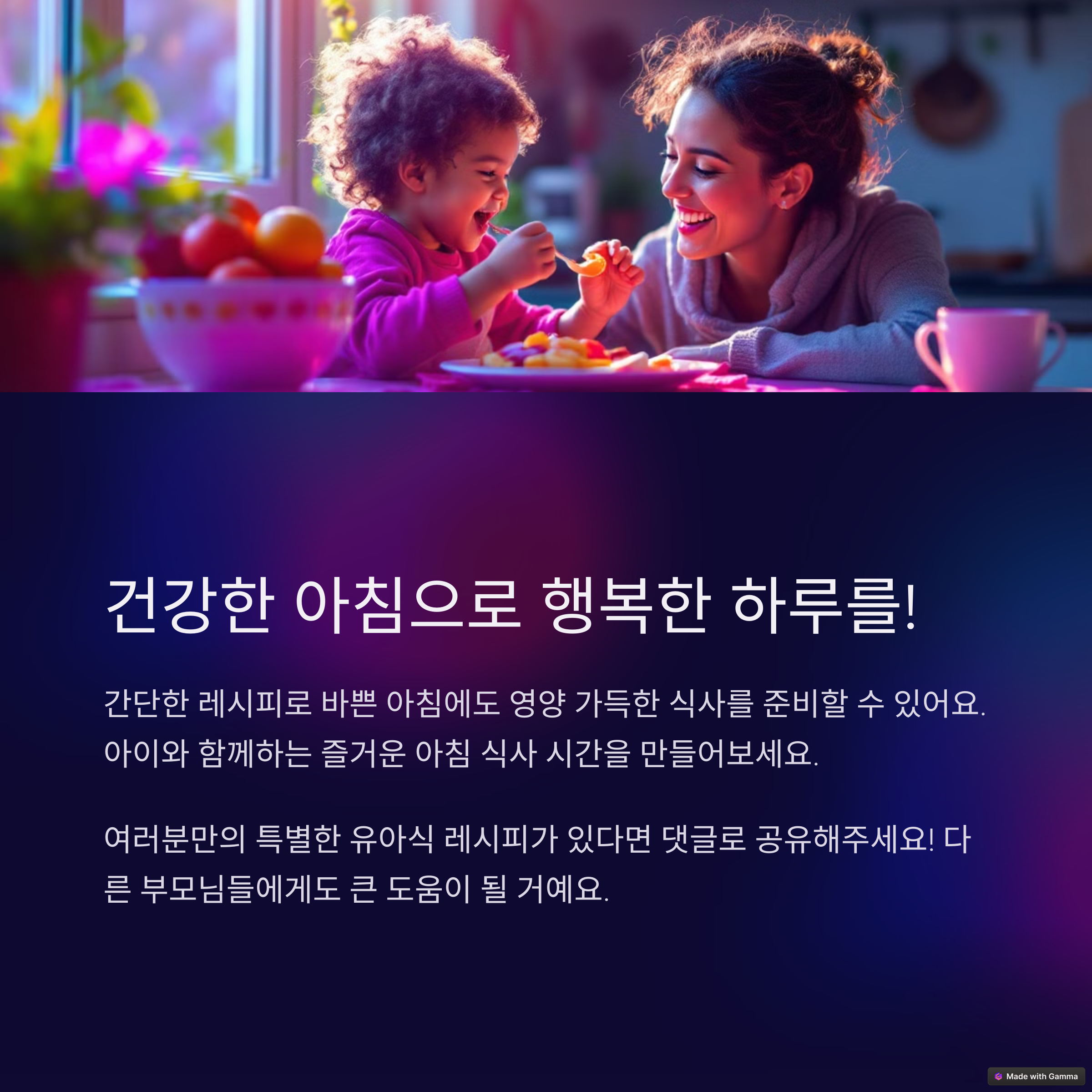여러분은 아침 유아식을 어떻게 준비하고 계신가요? 오늘 소개한 레시피 외에도 추천하고 싶은 메뉴가 있다면 댓글로 공유해주세요. 서로의 노하우를 나누며 아침 시간이 더 즐거워지길 기대합니다.