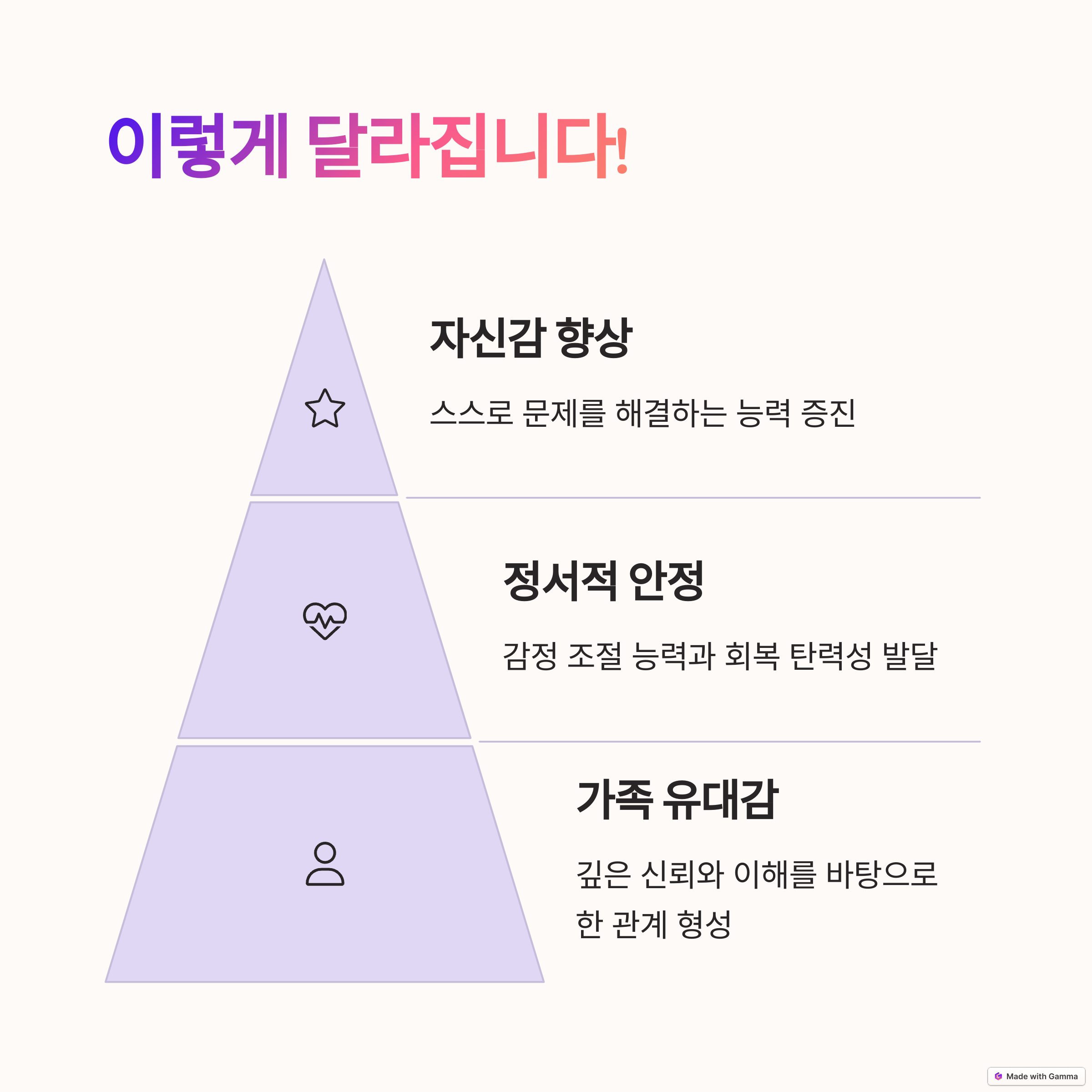 | 감정을 수용받은 아이는 더 빨리 안정을 찾는다. | 대화의 신뢰 기반을 다지는 핵심 요소이다. | 아이의 자율성과 문제 해결력을 높인다. |