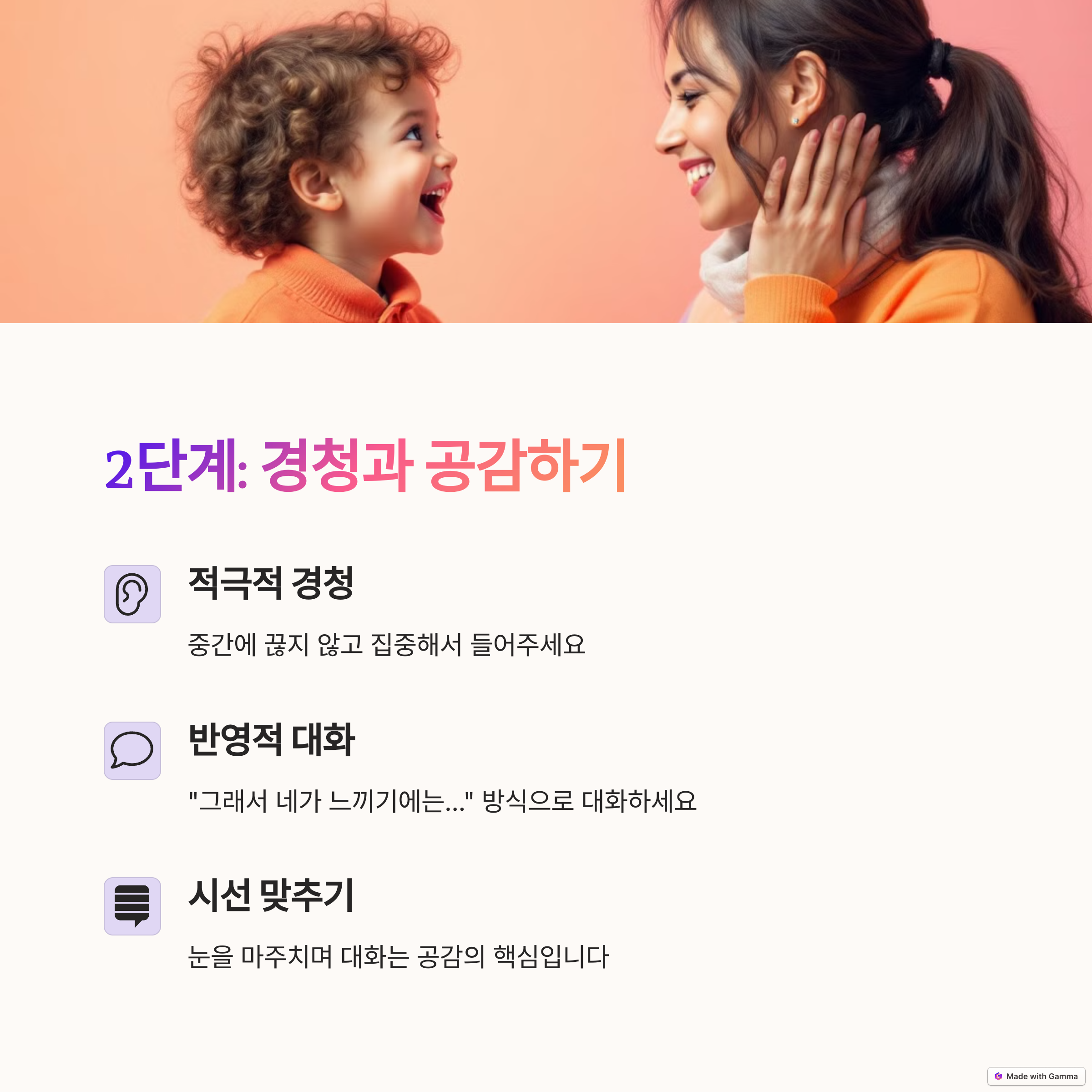 | 아이의 감정을 있는 그대로 받아들인다. | 판단 없이 아이의 말을 들어주는 것이 핵심. | 아이와 함께 방향을 모색하는 태도가 필요. |