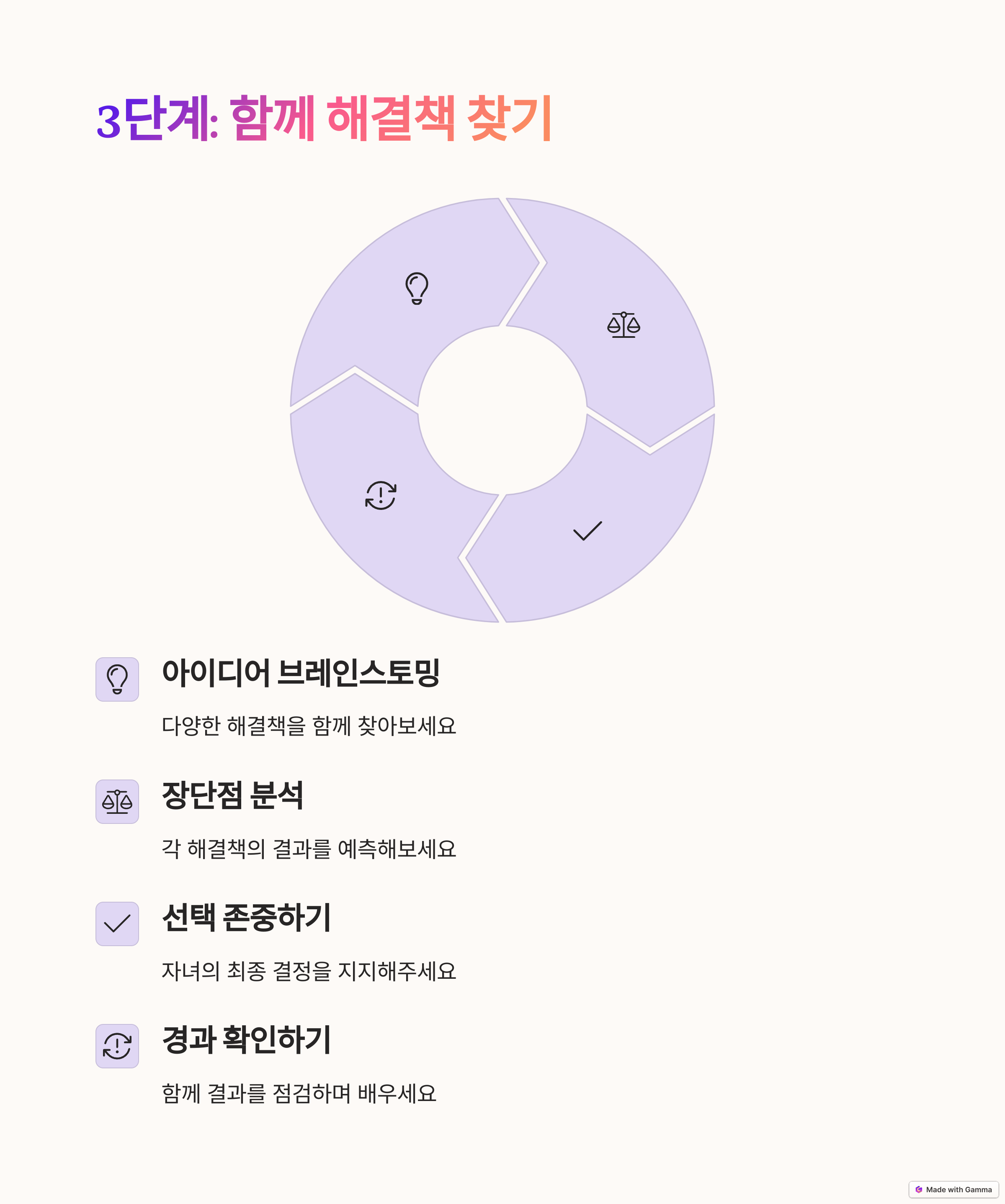 마지막 단계는 ‘함께 해결책 찾기’입니다. 공감 이후에는 아이와 함께 해결 방법을 찾아보는 시간이 필요합니다. “그럼 다음엔 어떻게 하면 좋을까?”라는 질문을 통해 아이 스스로 상황을 정리하고 대안을 고민할 수 있게 도와주세요. 이 과정에서 부모는 정답을 주는 사람이 아니라, 방향을 함께 모색하는 동반자가 되어야 합니다. 이런 대화 습관은 아이의 문제 해결 능력은 물론, 부모와의 신뢰관계도 깊게 만듭니다.