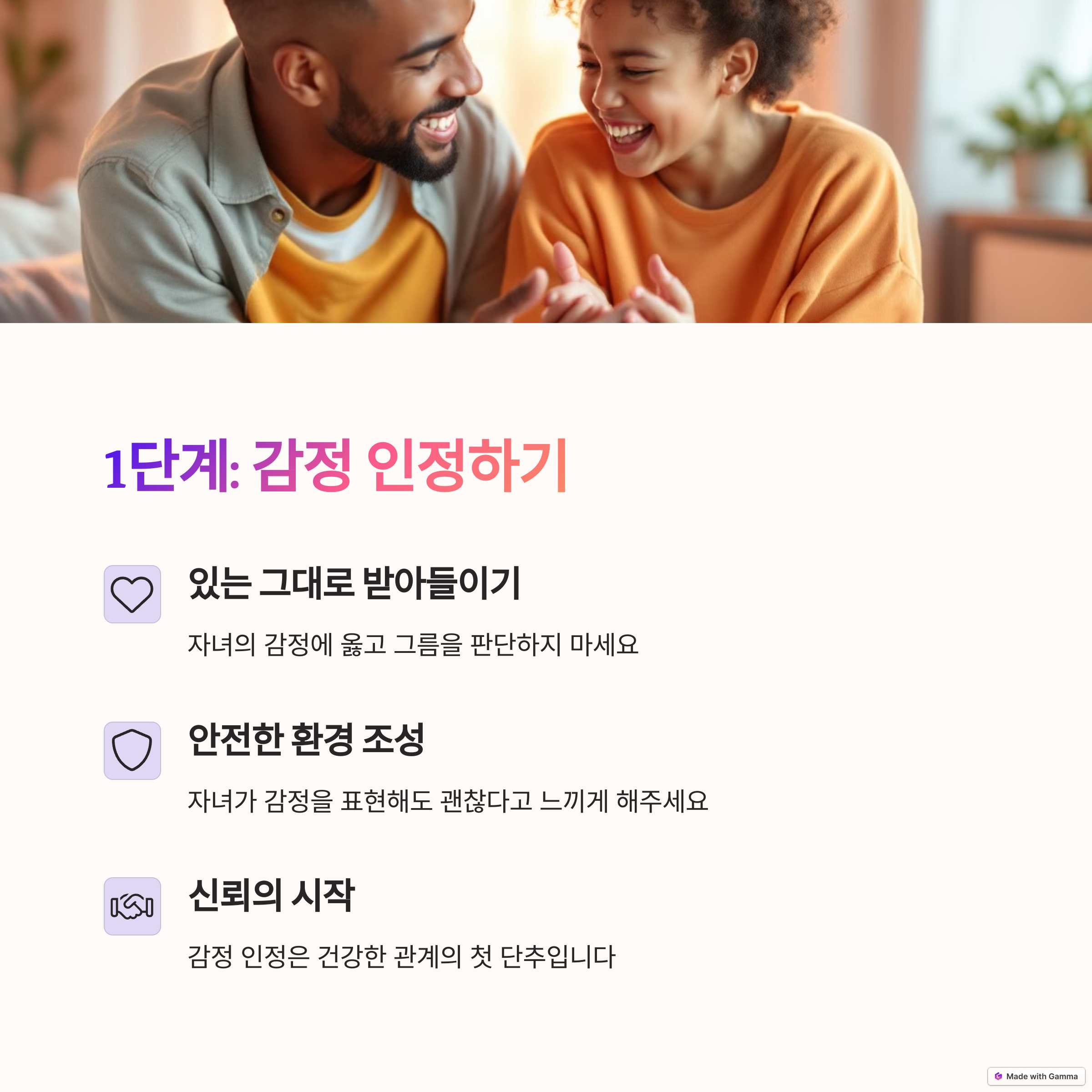 두 번째 단계는 ‘경청과 공감’입니다. 감정을 인정한 후에는 아이의 이야기를 충분히 들어주는 시간이 필요합니다. 이때 중요한 것은 아이의 말이 맞고 틀리고를 판단하지 않는 것입니다. 있는 그대로 받아들이고, 아이의 눈높이에서 생각하는 자세가 필요합니다. “그렇게 느꼈구나”, “그래서 속상했겠구나” 같은 말은 아이의 마음에 진심으로 다가가게 하는 다리 역할을 합니다. 부모의 이와 같은 태도는 아이의 자기 표현력과 정서 안정에 큰 도움이 됩니다.