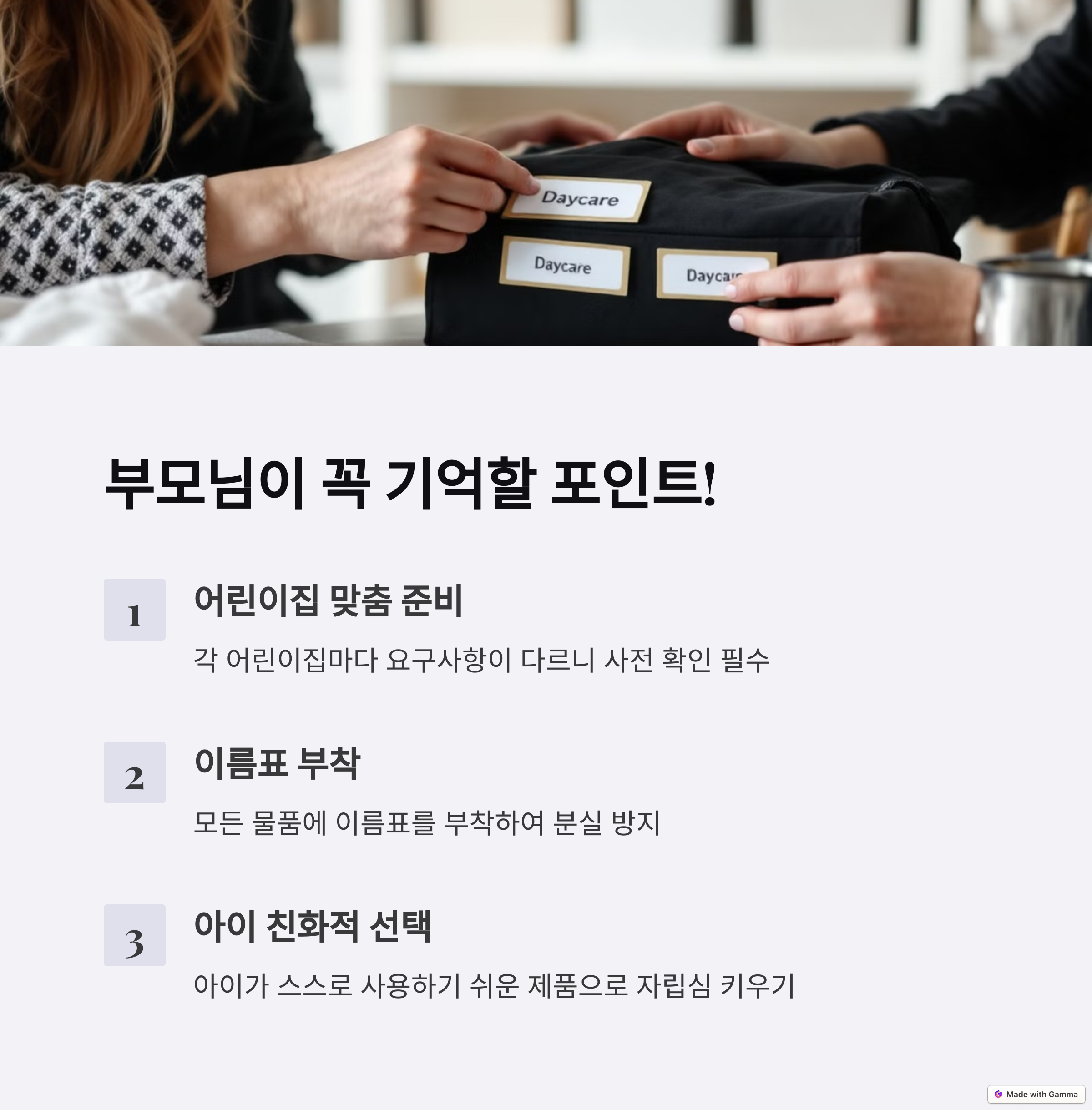 | 지퍼형으로 아이가 스스로 열 수 있어야 합니다. | 사계절용, 속통 분리형이면 실용적입니다. | 수저, 턱받이, 컵 모두 개인용으로 준비하세요. |