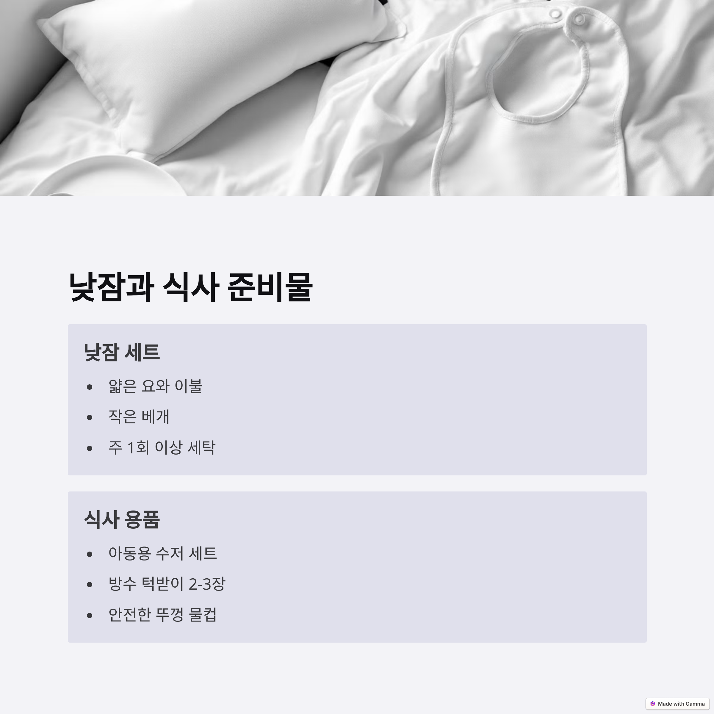 | 어린이집 가방 | 침구류 준비 | 식사용품 |
