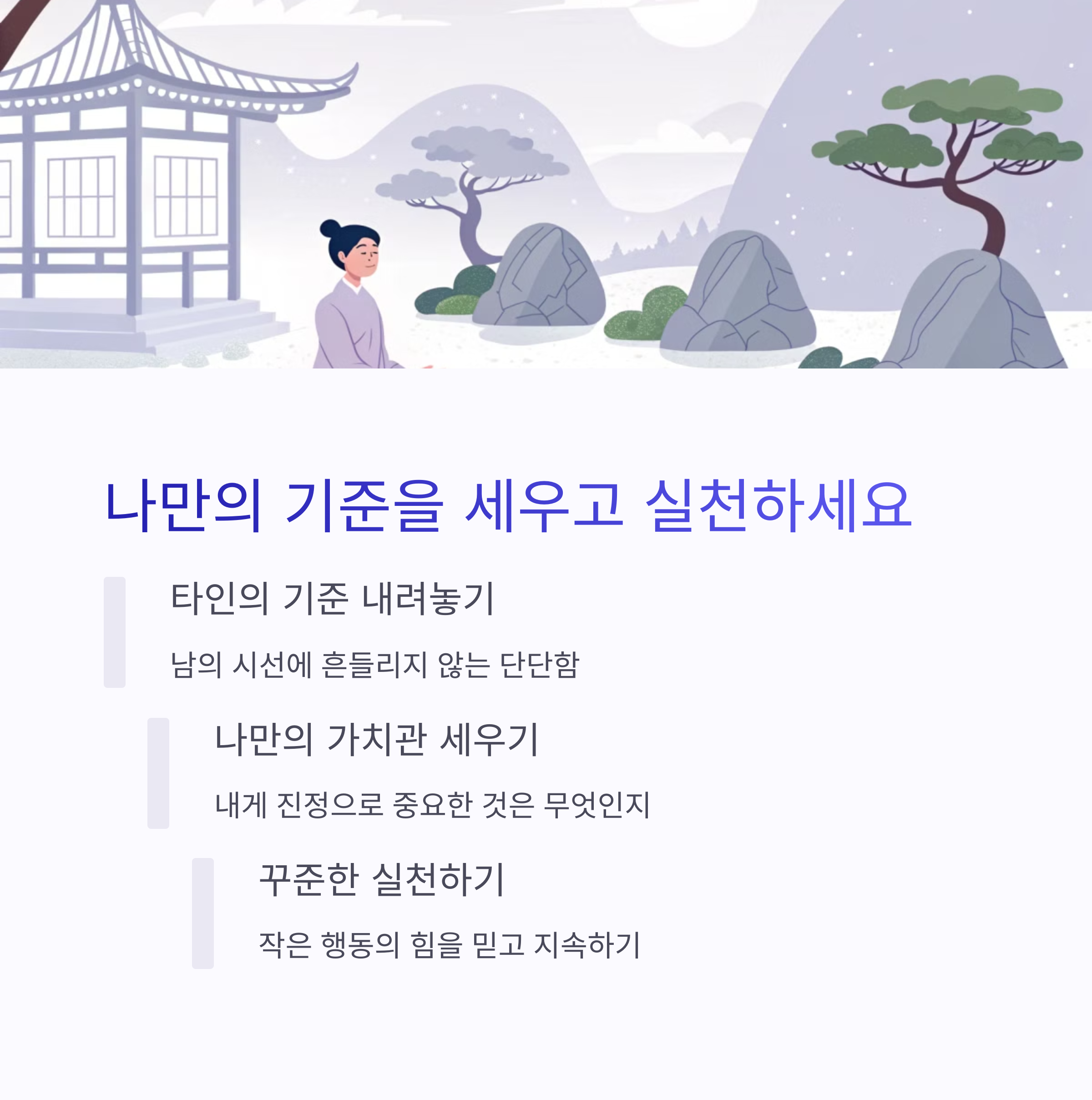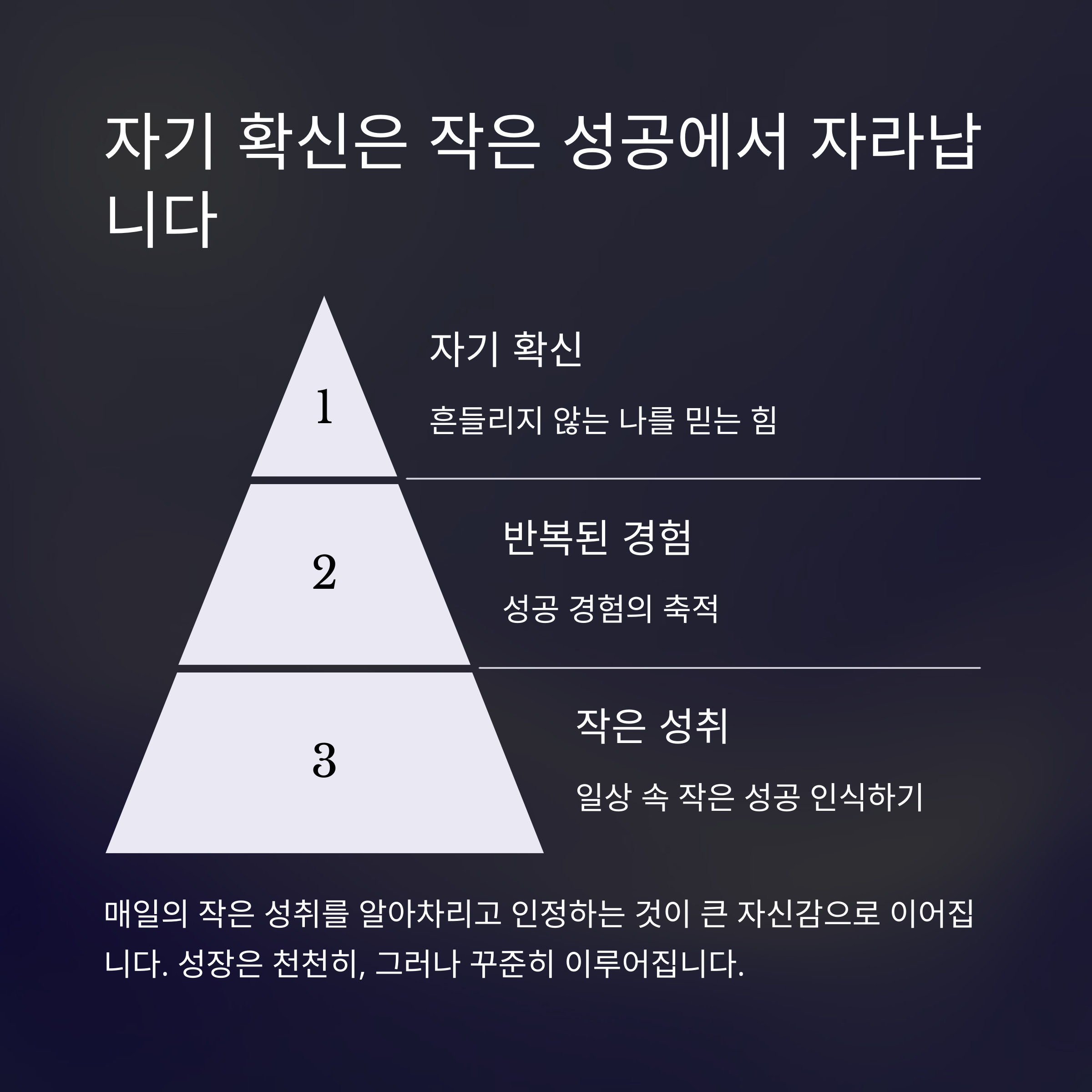 | 작은 성공도 기록하고 기억하는 습관이 필요합니다. | 자기 대화 속에 긍정 언어를 늘려 보세요. | 자신을 믿는 마음이 삶의 방향을 결정합니다. |