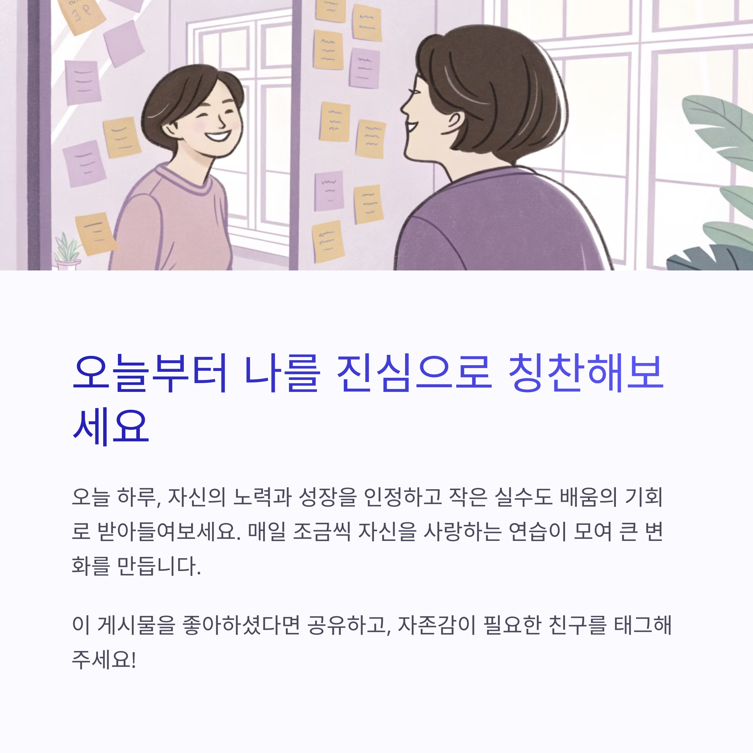 “내가 이런 것도 잘했어?” 하는 순간들이 있습니다. 이런 순간을 지나치지 않고 자신에게 칭찬하는 습관을 들여보세요. 오늘 친구에게 웃으며 인사한 자신, 불편한 상황에서도 침착했던 자신을 놓치지 마세요. ‘잘했어’, ‘괜찮아’, ‘멋져’ 같은 한 마디가 우리 내면의 든든한 지지대가 되어줍니다.