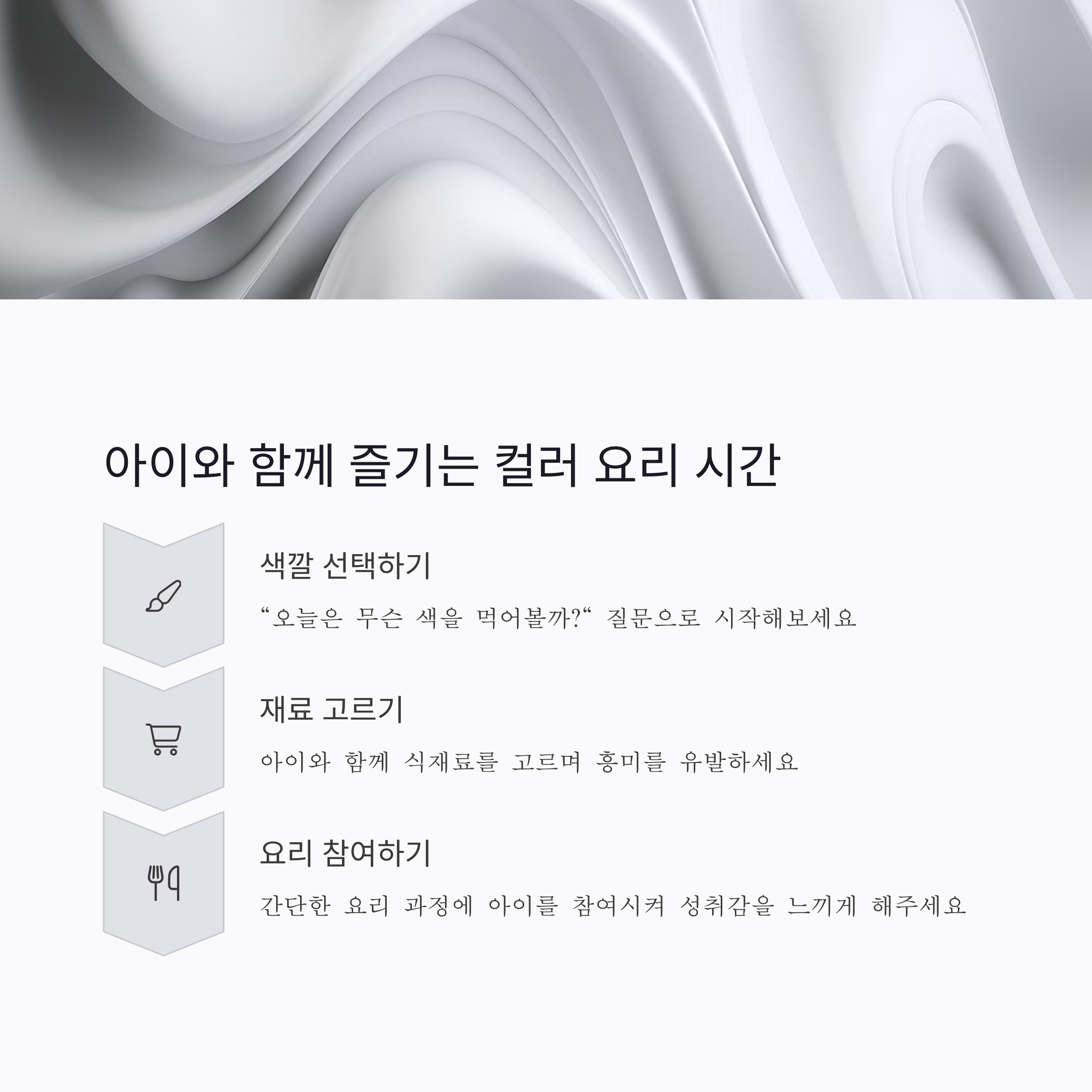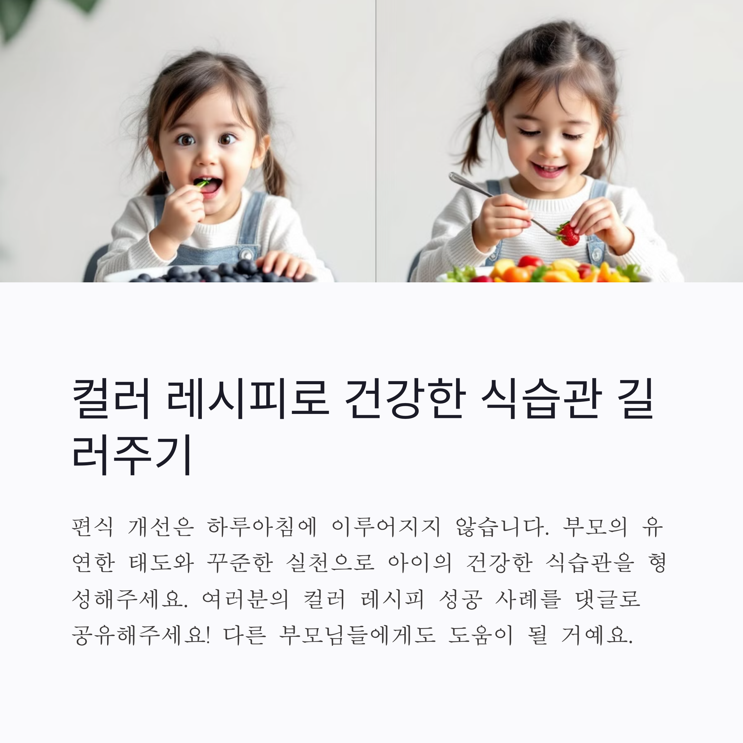 편식은 단시간에 해결되기 어려운 과제이지만, 아이의 시각과 입맛을 모두 고려한 컬러 레시피는 실질적인 도움이 될 수 있는 접근법입니다. 중요한 것은 부모님의 인내와 유연한 사고입니다. ‘먹이기’보다는 ‘즐기게 하기’를 목표로 한다면 아이는 자연스럽게 건강한 식습관을 만들어갈 것입니다. 오늘부터 한 끼 식사라도 아이와 함께 색을 고르고 이야기를 나눠보세요. 식탁은 단순한 식사가 아닌 소통과 배움의 공간이 될 수 있습니다.